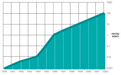 虽然声名狼藉的"网络"泡沫对金融市场产生了短暂影响,但数据通信业务量却呈现出一种稳定得多的趋势。然而,正如简单的均匀分布模型所表明的,通信业务总量的增长并没有直接带来相应的主干网带宽需求的扩大。相反,超过半数的万维网请求都只以估计总共20亿个网站中的头1000个为目标。大型互联网服务提供商都保留万维网缓存服务器来处理他们所接收的数量庞大的数据请求。这种服务策略实际上产生了许多不同地域的镜象网站,导致相当部分的互联网通信业务量不通过主干网,而是通信业务量的产生和终止都在同一网络之内(参考文献3)。