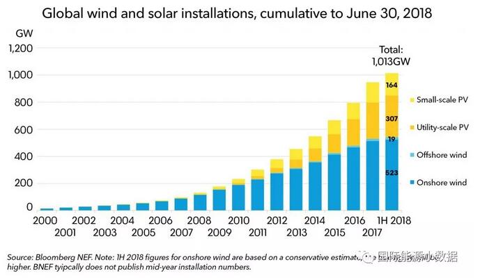 根据彭博新能源财经(BNEF)汇总的数据,至2018年6月底止全球风电、光伏的累计装机容量达到1,013吉瓦,超过了1,000吉瓦(1 TW)的里程碑。BNEF预计到2023年全球风电、光伏将再净增1,000吉瓦,届时总装机容量将达2,000吉瓦。