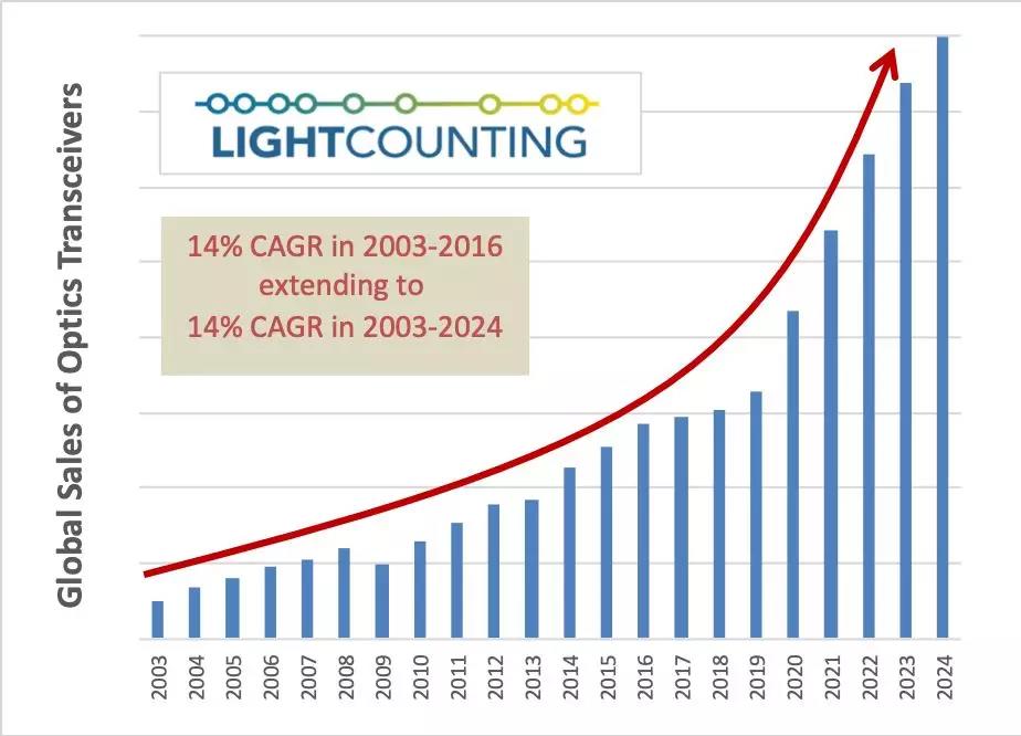 根据LightCounting发布的最新光通信市场预测报告,5G按期部署或成为促使全球光收发器市场有望在2003年-2024年间实现14%的复合年增长率(CAGR)的三大事件之一,如今5G牌照已发,迈出了市场预测中的第一步。