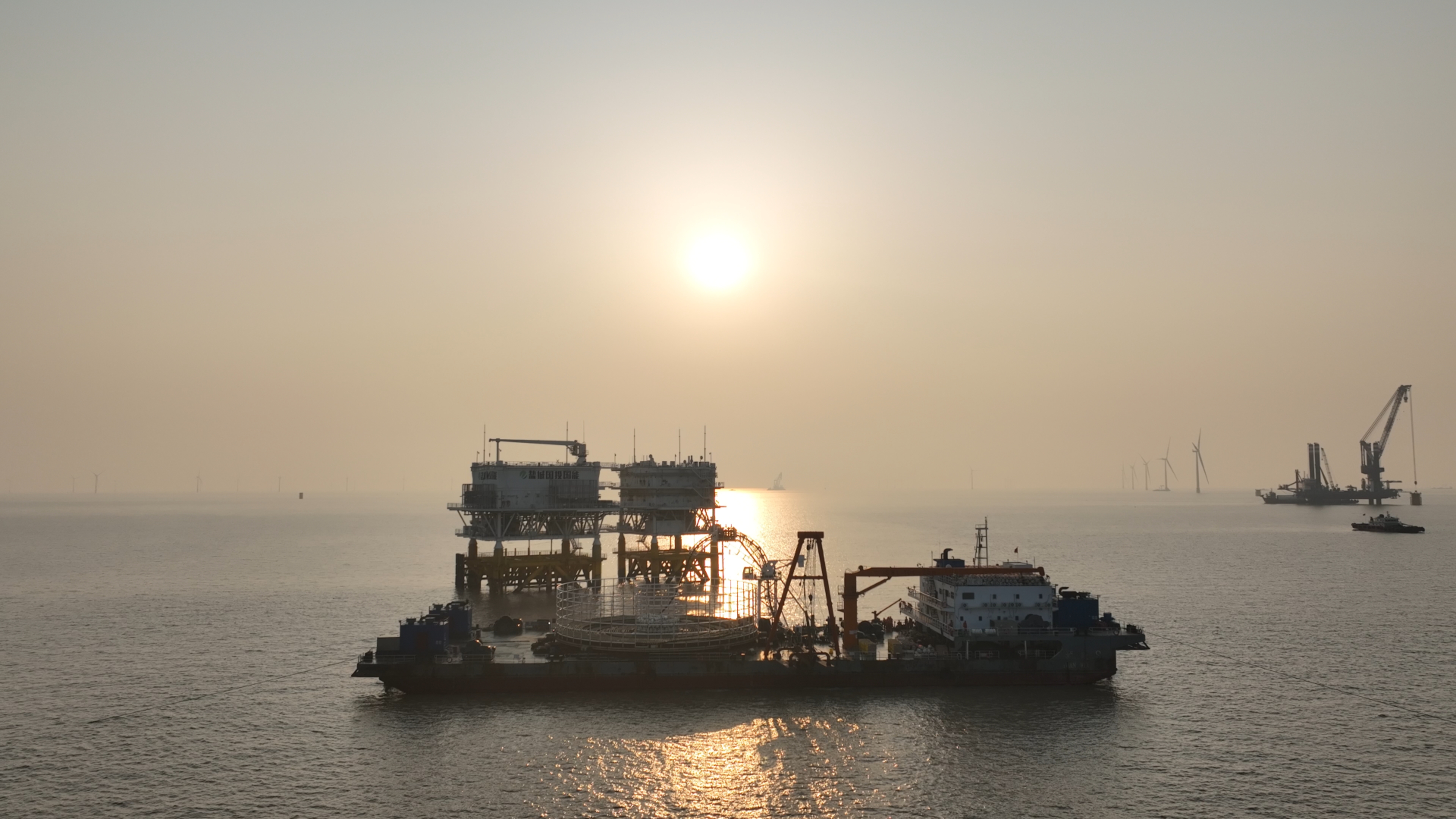项目场址离岸距离属国内项目最远,海况之复杂、作业窗口之短暂、施工条件之苛刻,均属国内罕见。面对这片“施工禁区”,中天科技项目团队以科技创新与管理创新双轮驱动,迎难而上。团队创新应用“超浅水特种施工工艺”与“高精度窗口期动态预测管理系统”,成功攻克了最浅水域机位(“85高程”-1.8米)的施工难题。在全年潮汛最大的时期,每日有效作业时间被压缩至仅4小时左右。通过前所未有的精细化管理与资源统筹,团队在确保工程安全的同时,更创造了惊人的建设速度:仅用不足6个月,便安全高效地完成了全部98台风机吊装,其中单台风机最快施工周期控制在40小时以内,有力助推项目在10个月内实现全容量并网,创造了深远海风电工程建设的“中天速度”。