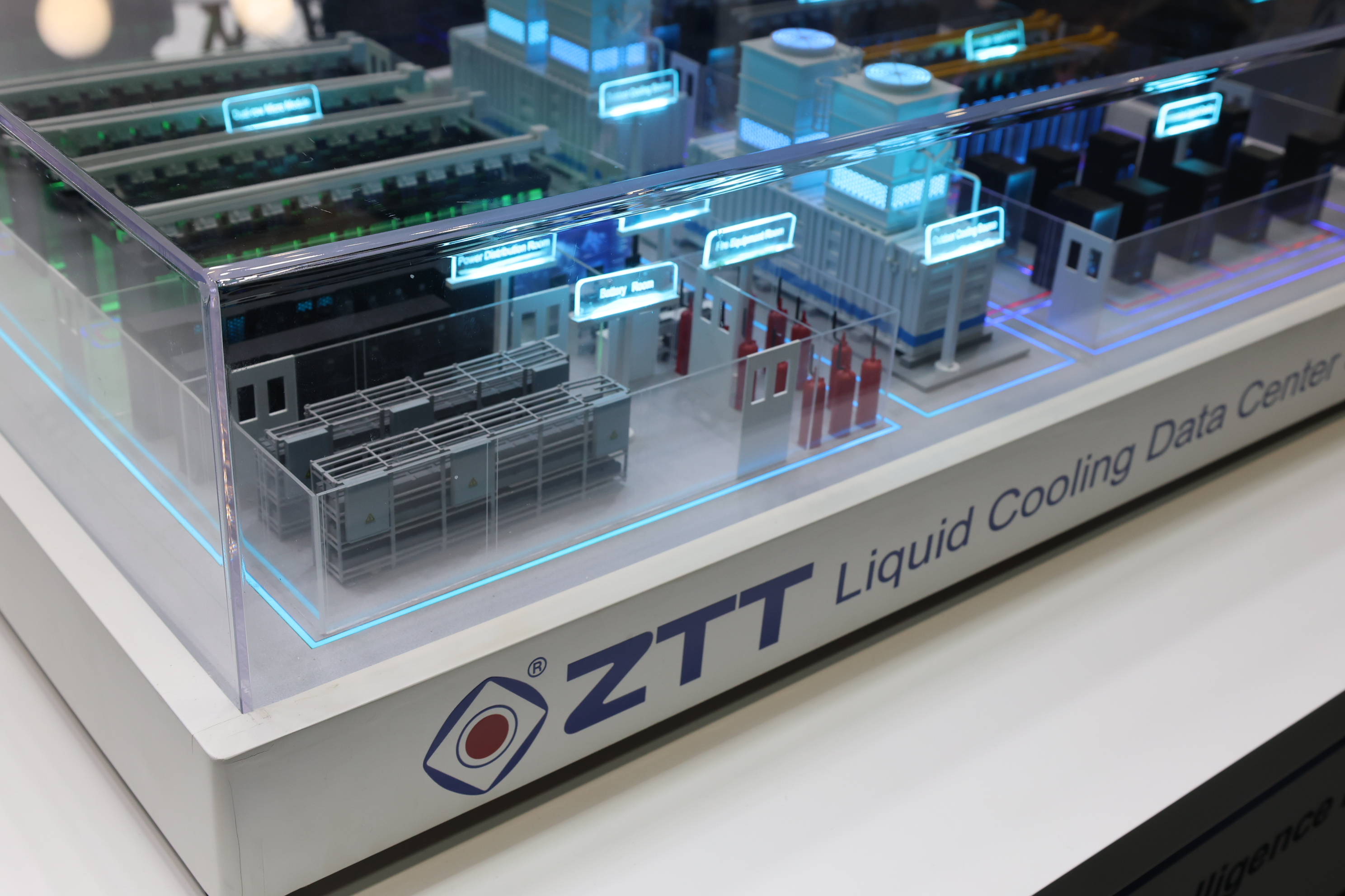 针对AI算力高密度、高能耗的挑战,中天科技通过沙盘模型,呈现了从供电到制冷的全栈解决方案。通过高度集成的智能电力模块及液冷解决方案,公司有效提升能源利用效率,助力数据中心实现更低PUE水平,满足高密度算力场景下的散热与稳定性需求。