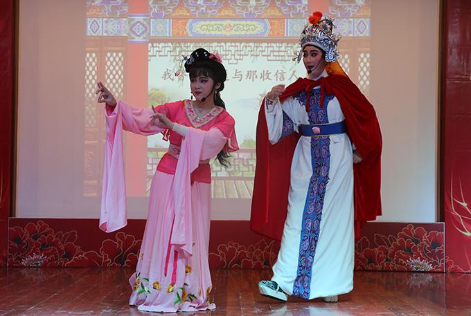 中天越剧班的学员们也不甘落后,丛娟、杨文秀、冒姚霞、潘美娟、李晓霞带来一曲美妙绝伦的越歌《兰花吟》;丛娟、朱美娟、戴美玲、缪春香表演的《孔雀东南飞•惜别离》旋律悠扬,甜蜜中带着苦涩,将焦仲卿与刘兰芝的爱情故事演绎得入木三分,让在场观众深深震撼;中天越剧班的绝色双娟更为大家献上一曲气壮山河的《送信》,不禁让观众感叹“儿女情换山河恋,大动干戈化玉帛”的情怀。