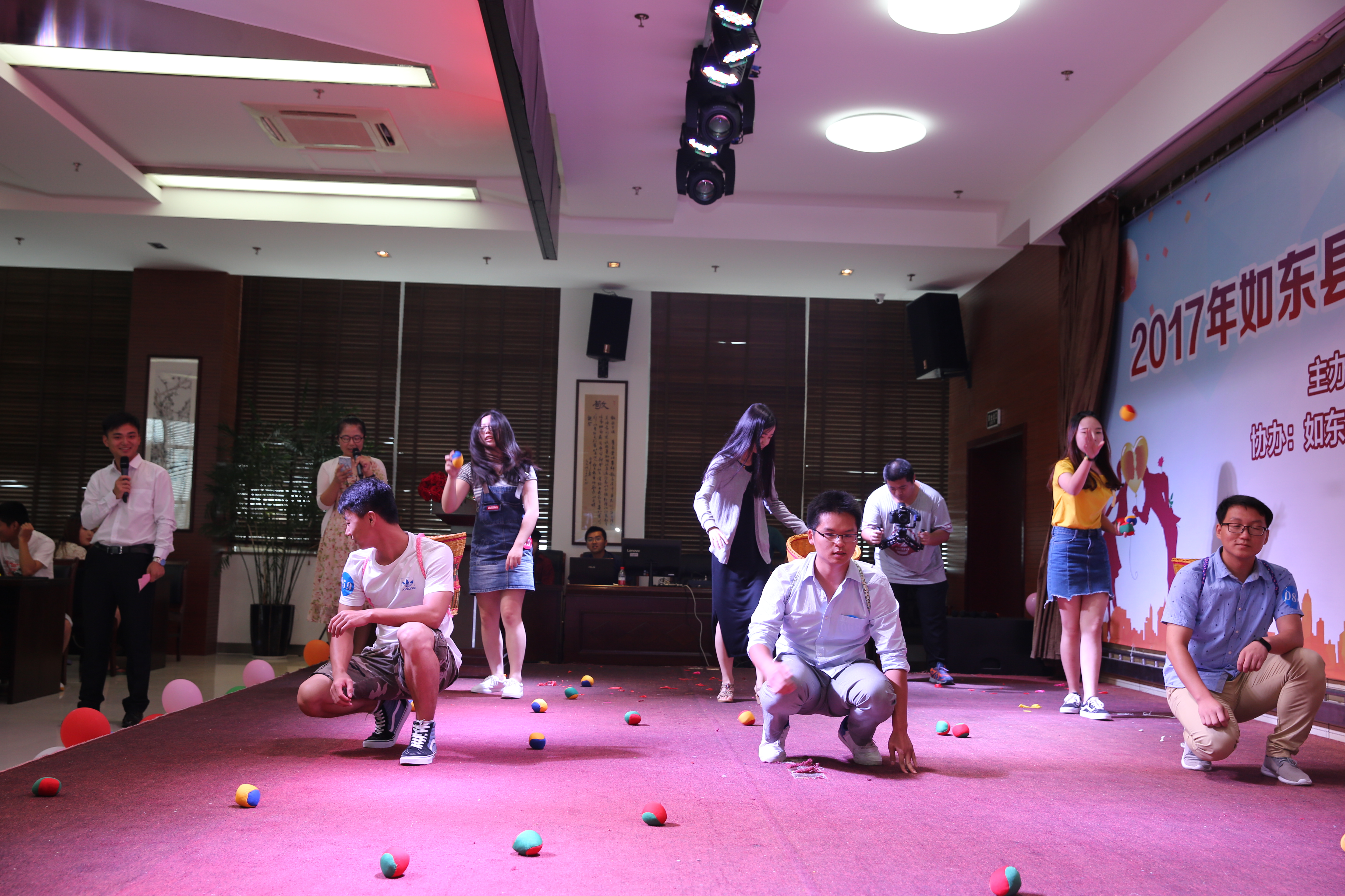 在充满温馨浪漫气氛的现场,单身青年们按照一男一女形式相隔而坐,通过抛绣球、背靠背夹气球、投沙包、浓情蜜意等环节让彼此进行初步接触,逐渐将现场气氛推向高潮。